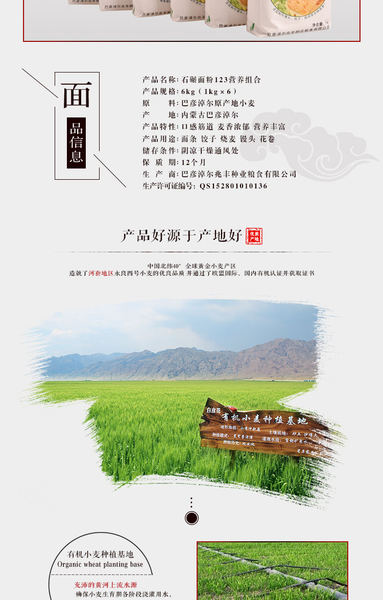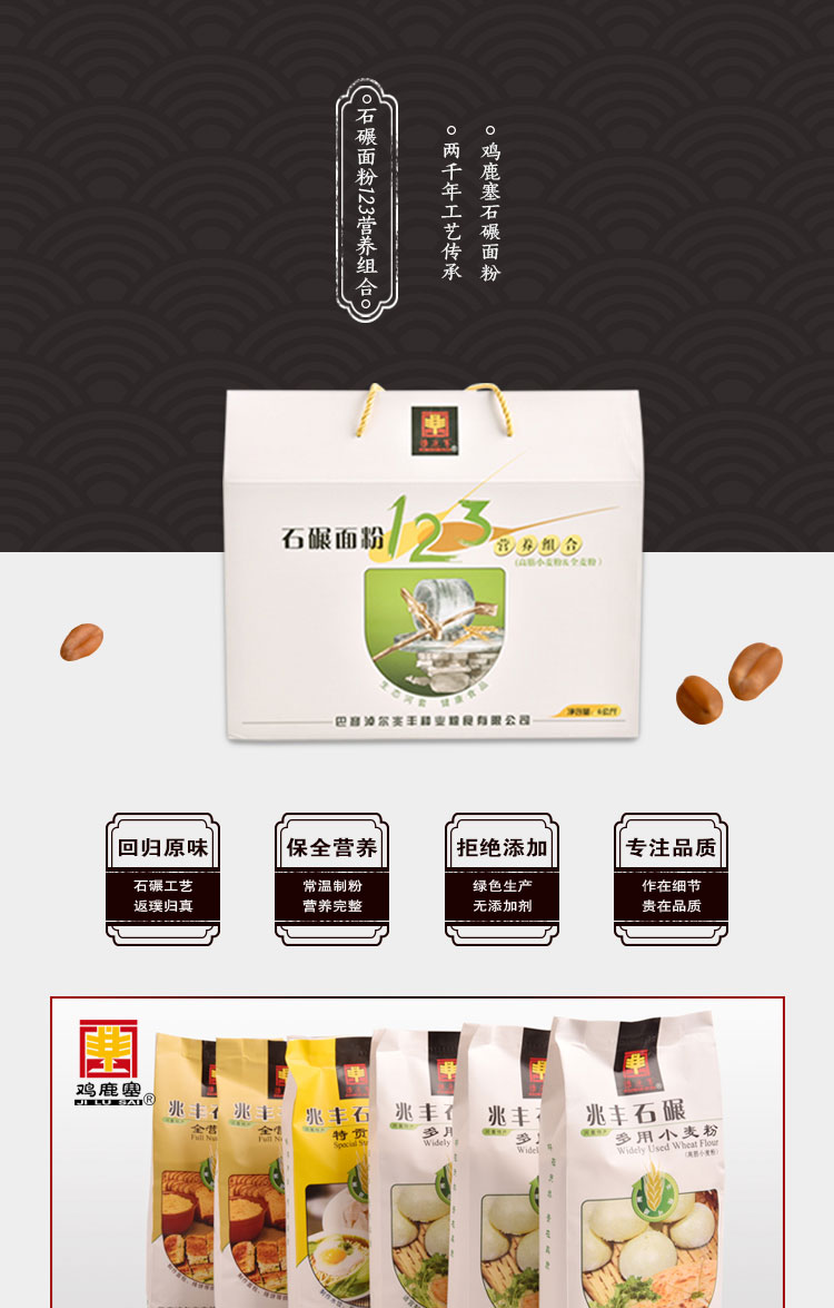 產(chǎn)品名稱(chēng):雞鹿塞 石碾面粉123營(yíng)養(yǎng)組合 禮盒 6kg 河套高筋面粉 禮盒