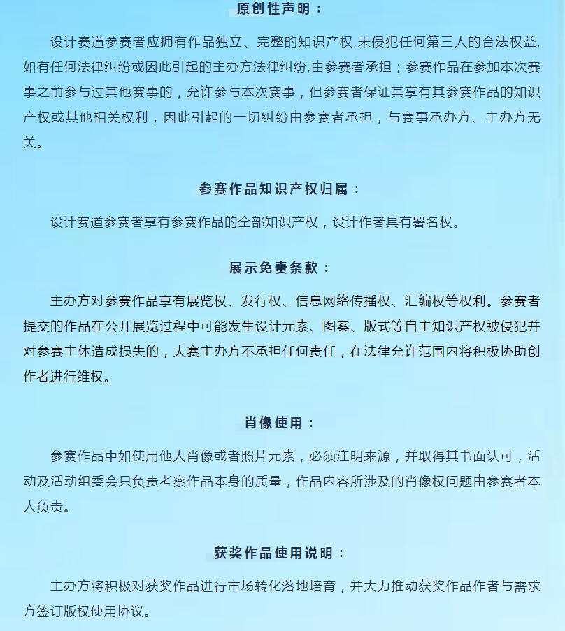 設(shè)計(jì)賽道作品獎金不包含作品版權(quán),版權(quán)購買形式及費(fèi)用由需求單位與獲獎作者自行協(xié)商確定。