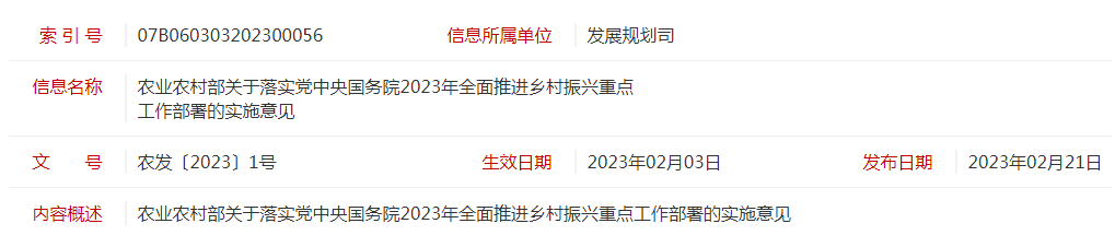 標(biāo)題:農(nóng)發(fā)〔2023〕1號農(nóng)業(yè)農(nóng)村部關(guān)于落實黨中央國務(wù)院2023年全面推進(jìn)鄉(xiāng)村振興重點工作部署的實施意見